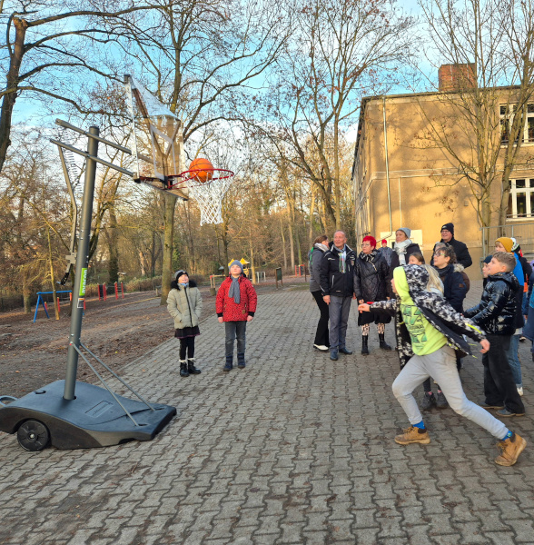 Als die Osterweddinger Grundschüler am 02.12.2025 zur großen Pause auf den Schulhof stürmen, erleben sie eine große Überraschung. Auf dem Schulhof steht ein niegelnagelneuer Basketballkorb. Zur feierlichen Übergabe waren Bürgermeister Jörg Methner, sowie die Avacon-Referentinnen Cora Landshuter und Antje Klimek an die Schule gekommen.
