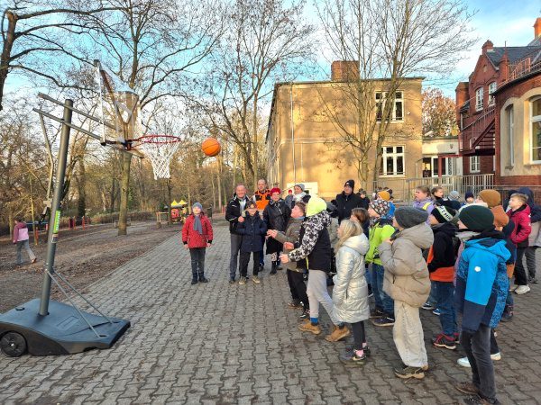 Als die Osterweddinger Grundschüler am 02.12.2025 zur großen Pause auf den Schulhof stürmen, erleben sie eine große Überraschung. Auf dem Schulhof steht ein niegelnagelneuer Basketballkorb. Zur feierlichen Übergabe waren Bürgermeister Jörg Methner, sowie die Avacon-Referentinnen Cora Landshuter und Antje Klimek an die Schule gekommen.